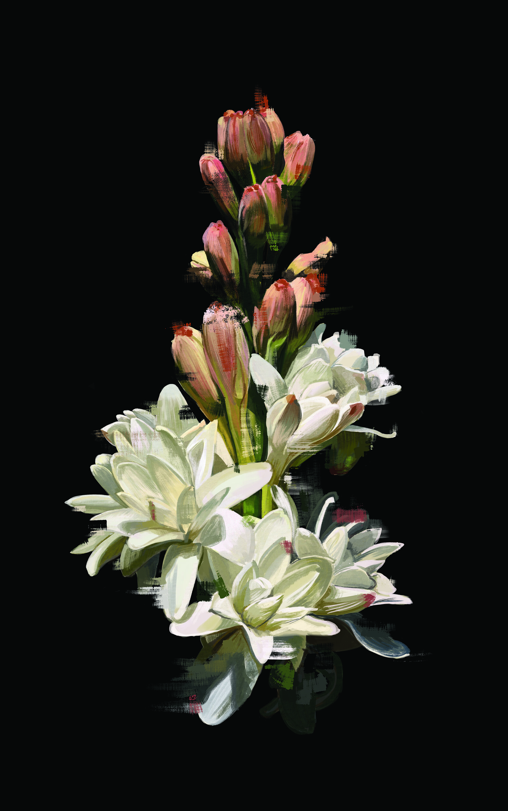 А ночью аромат цветка туберозы раскрывается иначе. Он становится богаче, приобретает дурманящие ноты пышного букета белых цветов, кожи под солнечными лучами, янтарного мёда и первого снега.